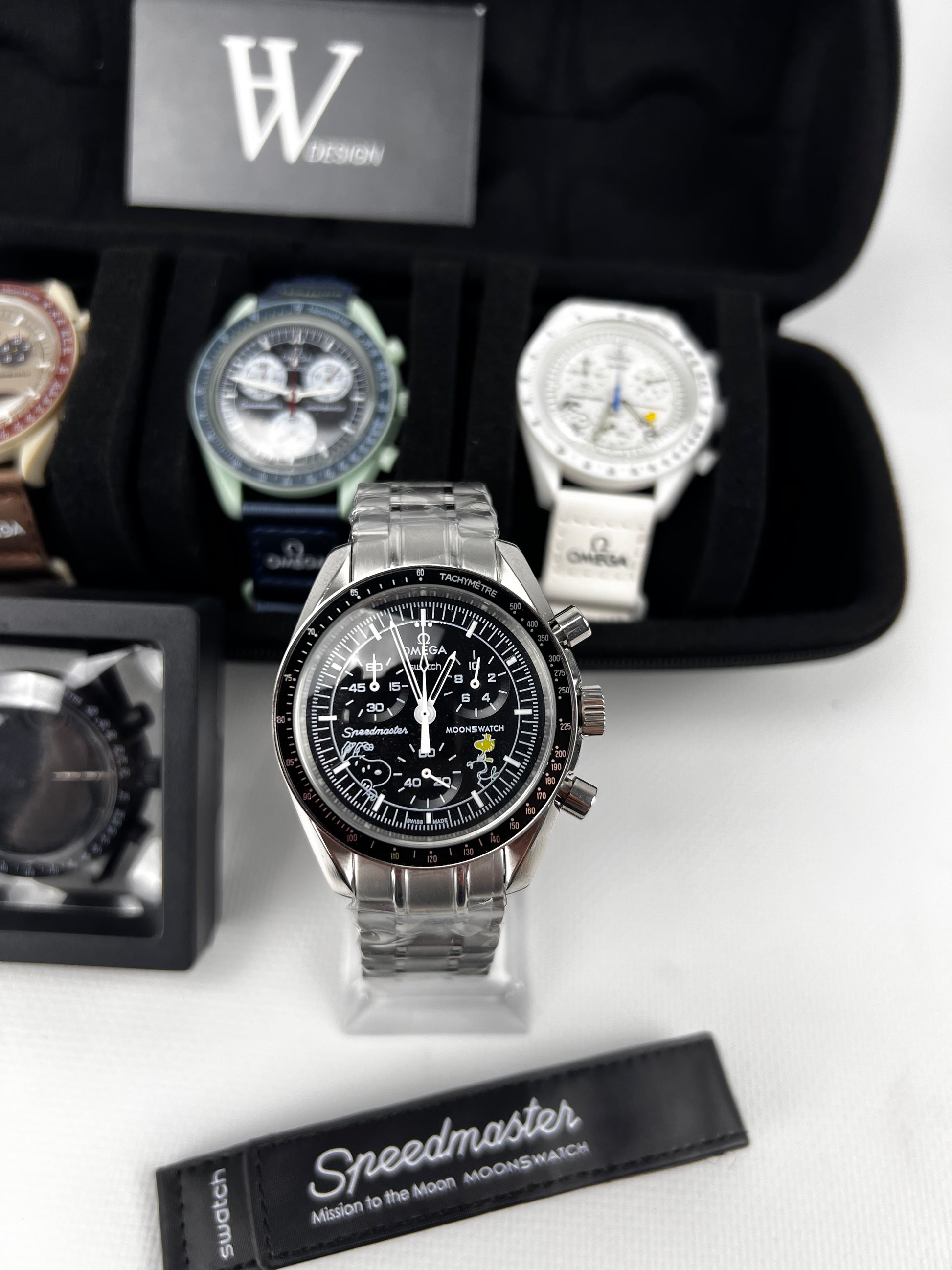 Basado en el Omega x Swatch Mission to Moon Black Snoopy, en HW presentamos su mejor versión, reemplazando la caja original de plástico por una caja y correa en acero inoxidable 316l y cristal de Zafiro.